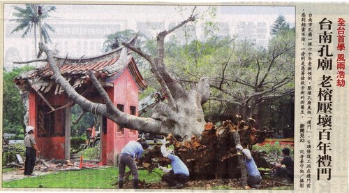 四月八日聯合報頭版刊登了一張相片,標題為「全台首學 風雨浩劫」「台南孔廟 老榕壓壞百年禮門」,簡文中敘述:台南市孔廟一棵六十年老樹傾倒,壓壞孔廟東側禮門,「古蹟修復工站在禮門前,感到相當不捨,一旁則是急著搶救老樹的樹醫生…..」。一張相片簡短數字卻顯示了立場不相同之人的心境,百年禮門、一甲子老樹,孰重孰輕?則是見仁見智。 四月九日 報載:新北市江翠國中因闢建停車場及游泳池將移植工地內一棵老樹,昨天在大批警力戒護下,護樹超過260小時的護樹志工被工程包商工人用「搖樹」方式,迫使護樹志工無力抵抗被拉下。兩則新聞都牽涉到「建築硬體」及「老樹」,前者尚可怪罪於天災,而後者又要怪罪於誰呢?但最後的受害者卻是「無言」的老樹。目前無論是公家機關或是私人企業的執事心態,往往是用最快速度建設、修復一座座的硬體建築,但對一棵棵歷經漫長風雨歲月、天災人禍才得以存活,且無法「速成」的老樹,不是遷植到另個地方水土不符,或豎立個解說牌表示列管,後續則乏人照護任其自生自滅,有幸者蒙社區居民、志工照護下才得以存活。